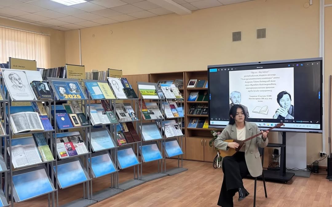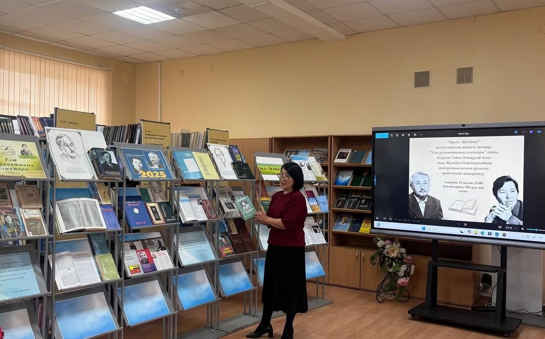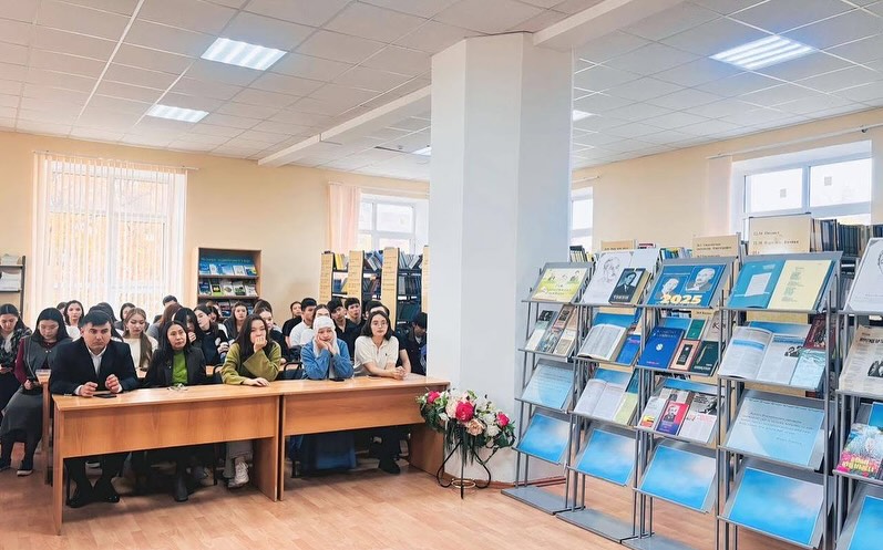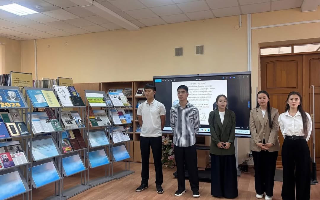 October 15, 2025. As part of the republican campaign "One country - one book", a literary evening entitled "Legends of the Spirituality of the Nation" was held, dedicated to the work of the outstanding writer, poet, artist Taken Alimkulov and the outstanding poet in the genre of poetry Zhumeken Nazhimedenov. The goal of the campaign is to read and promote the best works of our national literature, preserve our spiritual heritage, as well as provide spiritual, moral and patriotic education to young people. The literary evening began with the national anthem to the words of Zhumeken Nazhimedenov, performed by Askhat Baidauletov, a 1st year student of VI-11 BBB. The event began with a video dedicated to the life of the poet Zh. Nazhimedenov and the writer T. Alimkulov. Rita Sultangaliyeva, Associate Professor of M. Utemisov West Kazakhstan University, Candidate of Philological Sciences, shared valuable information, focusing in detail on the lives and works of the twin stars of Kazakh literature, T. Alimkulov and Zh. Nazhimedenov. During the evening, the poet's works were performed by the student of the KTA(IP)-21 group U. Oryngali "We are ourselves", the student of the G- IP 11 group A. Lesbay "Bairau cloud slows down the new road", the student of the KYAL IP-17 group A. Nurlanovna "Zhan-zharym, at the bottom of that green poplar", the student of the MO13 group M. Mukhammediyar Tengiz, the student of the YUR-11 group A. Sovetuly "My nature is easy sometimes", the student of the KTA(IP)-23 group A. Bimukhan "My country", the student of the KTA IP -23 D. Tulebay Auldy sagynu, the student of the KYAL Ip-11 group A. Myrzagerey "Kos konyr kaz", the student of the G- 11ir Zhumantai Yernur "Your beloved beauty", the student of the UiA-12 group R. Galbieva "Poet and girl", the student of the KTA -41 group student B. Mukhtarov read the poems "Dala" with an accent. Gradually, questions were asked about the poet's work and feedback was given with interest from the students. During the evening, Ayazhan Nurlanovna, a student of the KYAL ip-17 group, performed the kumbhirlegen kyui "Erke sylkym". Librarian R. Mazimova conducted a bibliographic review of the book exhibition "Legends of the Spirituality of the Nation" dedicated to the works of the writer T. Alimkuov and the poet Zh. Nazhimedenov. At the end of the evening, the head of the reader's demand department, Sadap Suyesinovna, expressed her gratitude to the students of each faculty who participated in the event.